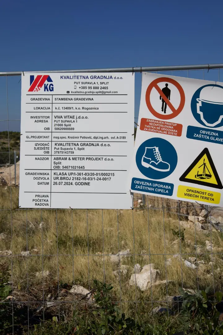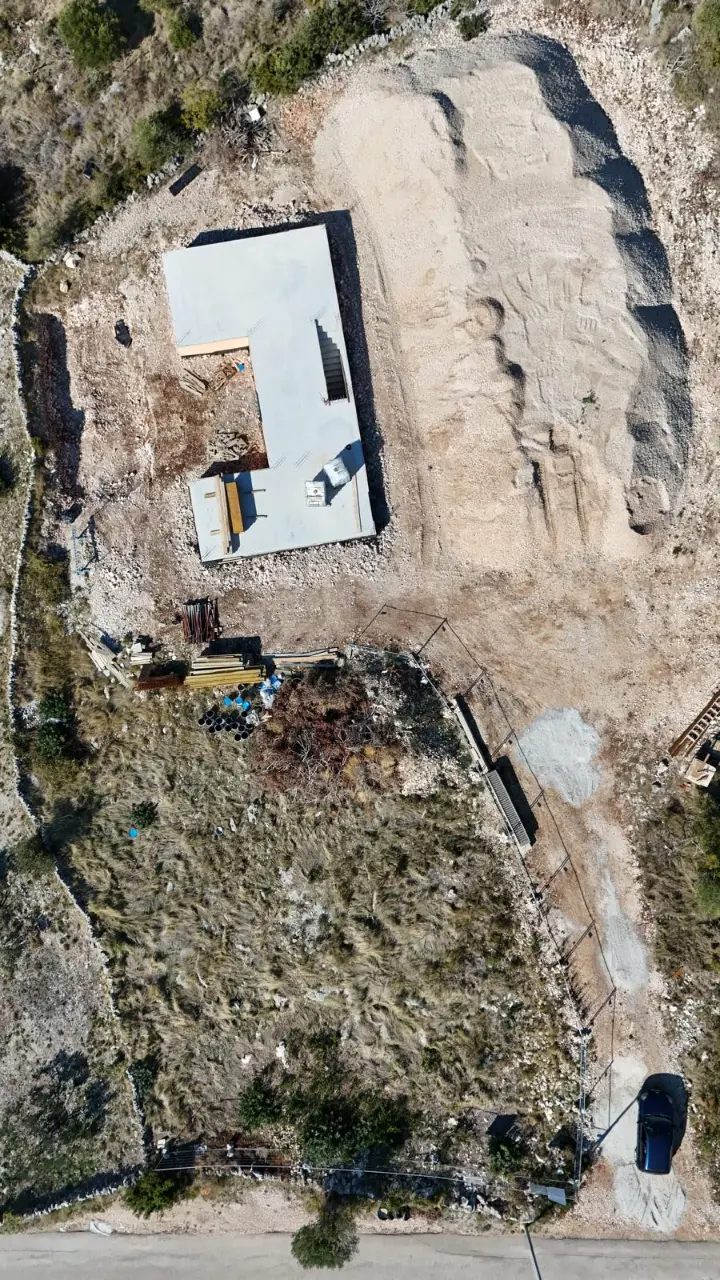 Construction works are well underway on site in Kanica, Rogoznica, where the villa’s foundations and main structural elements have already been completed. The outline of the building now clearly reveals its modern geometric form and the spacious terraces that will open toward the sea.