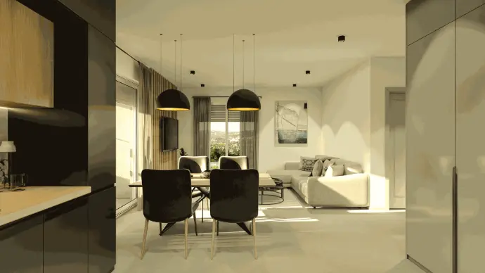 This modern one-bedroom apartment is part of a newly built residential complex in the scenic coastal town of Rogoznica. Designed for efficiency and comfort, it offers a functional layout, high-quality finishes, and a private loggia, perfect for a holiday home or investment property.