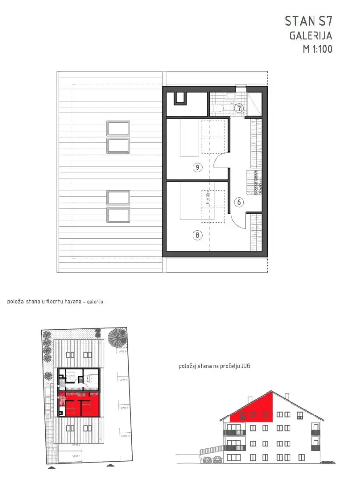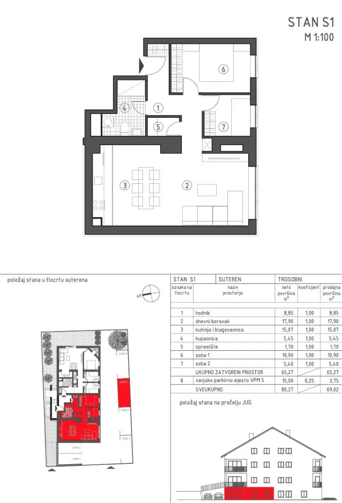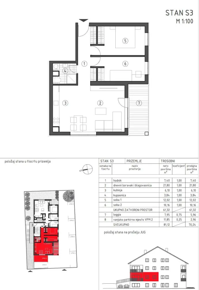 Закрытое пространство: 100,54 м2, с несколькими спальнями, ванными комнатами и жилыми зонами. С южной стороны с