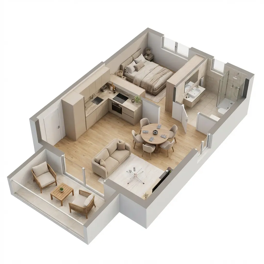 The main living areas open naturally toward the daytime zone, while bedroom and bathroom are located in quieter, more private parts of the apartment.