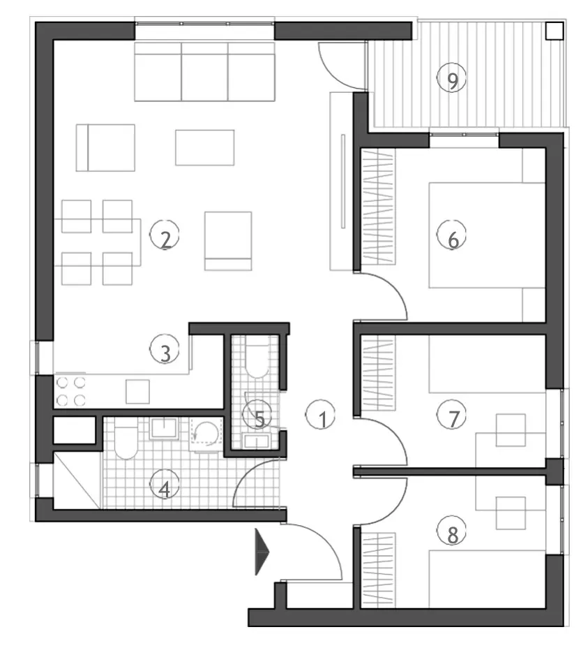 When you enter the apartment, you step into an 5,40 m² hallway that provides access to the bathrooms, and three bedrooms.