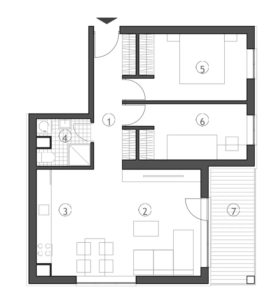 This layout ensures privacy for the bedrooms while maintaining a spacious, social atmosphere in the daytime zone, making the apartment ideal for family living, everyday comfort, and hosting guests.
